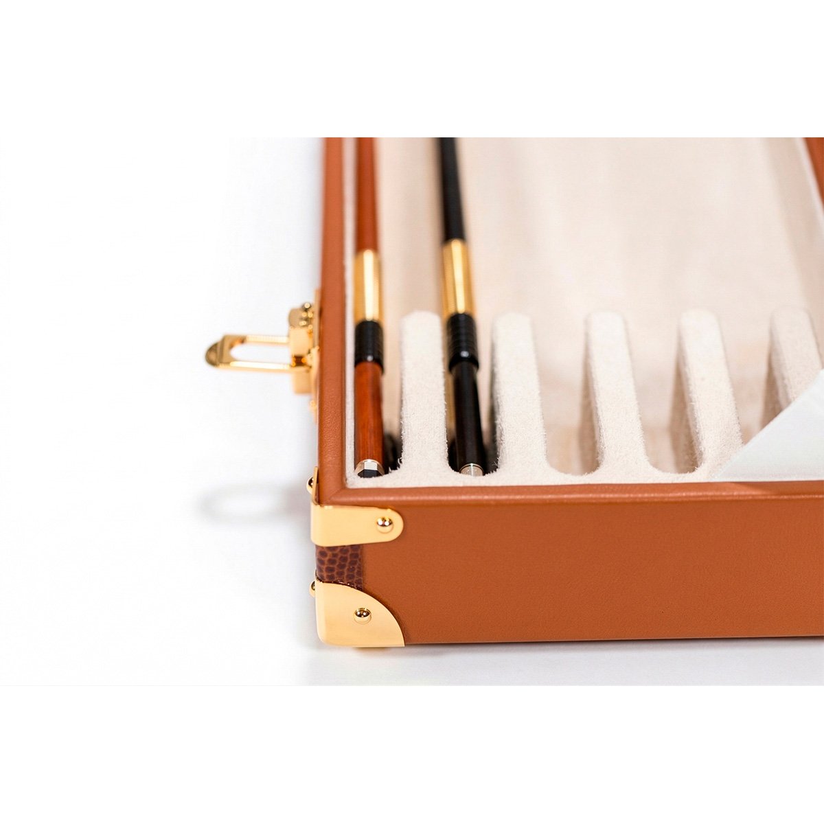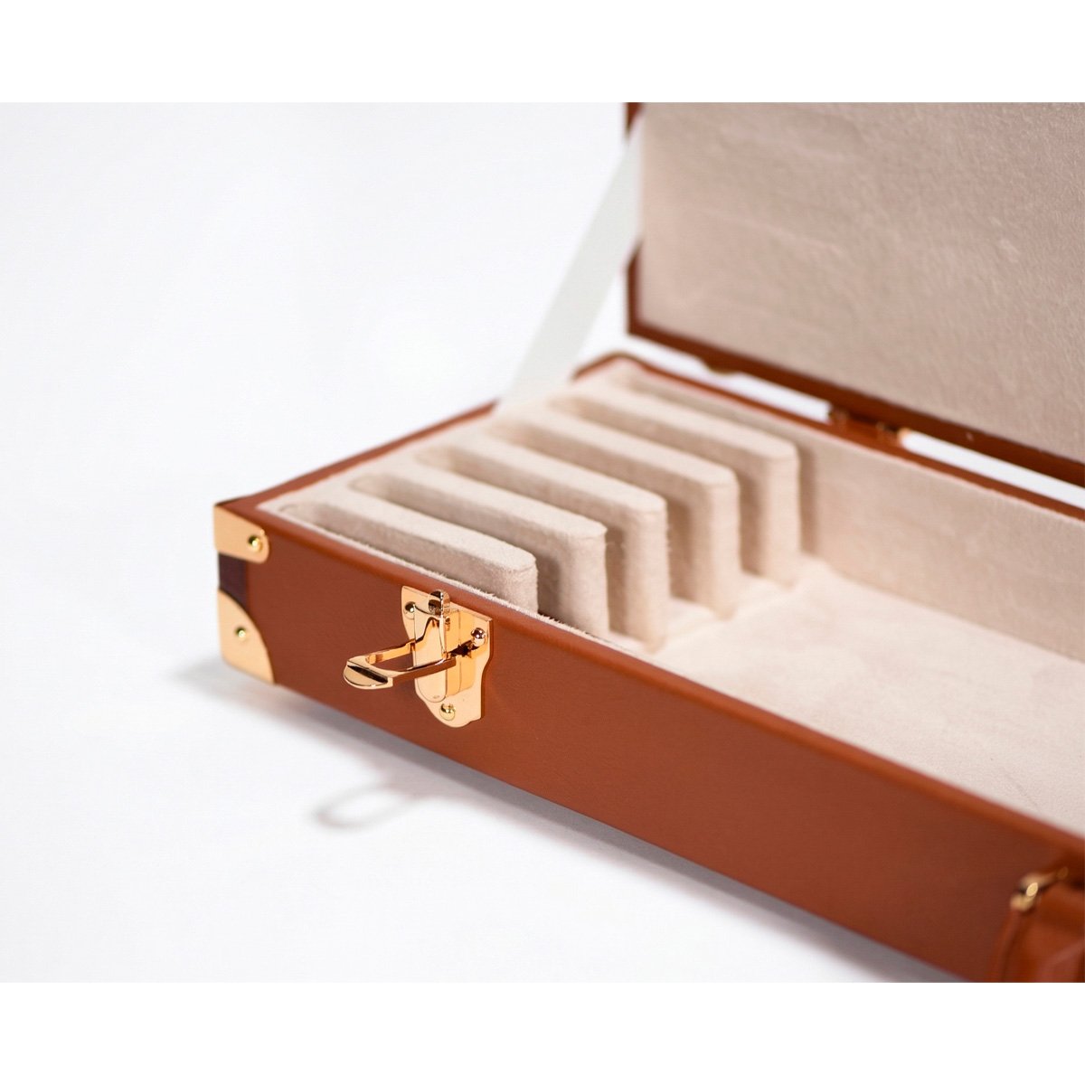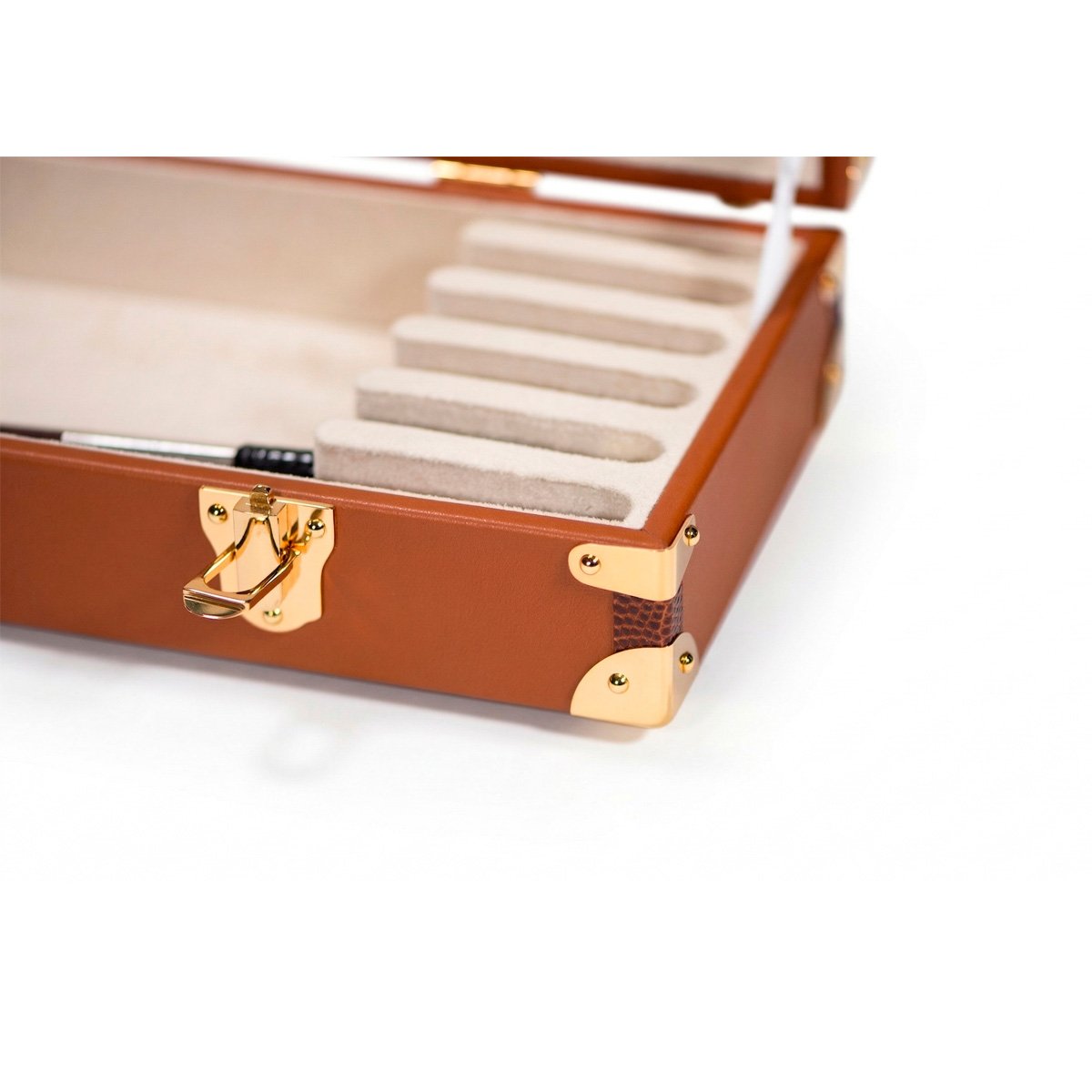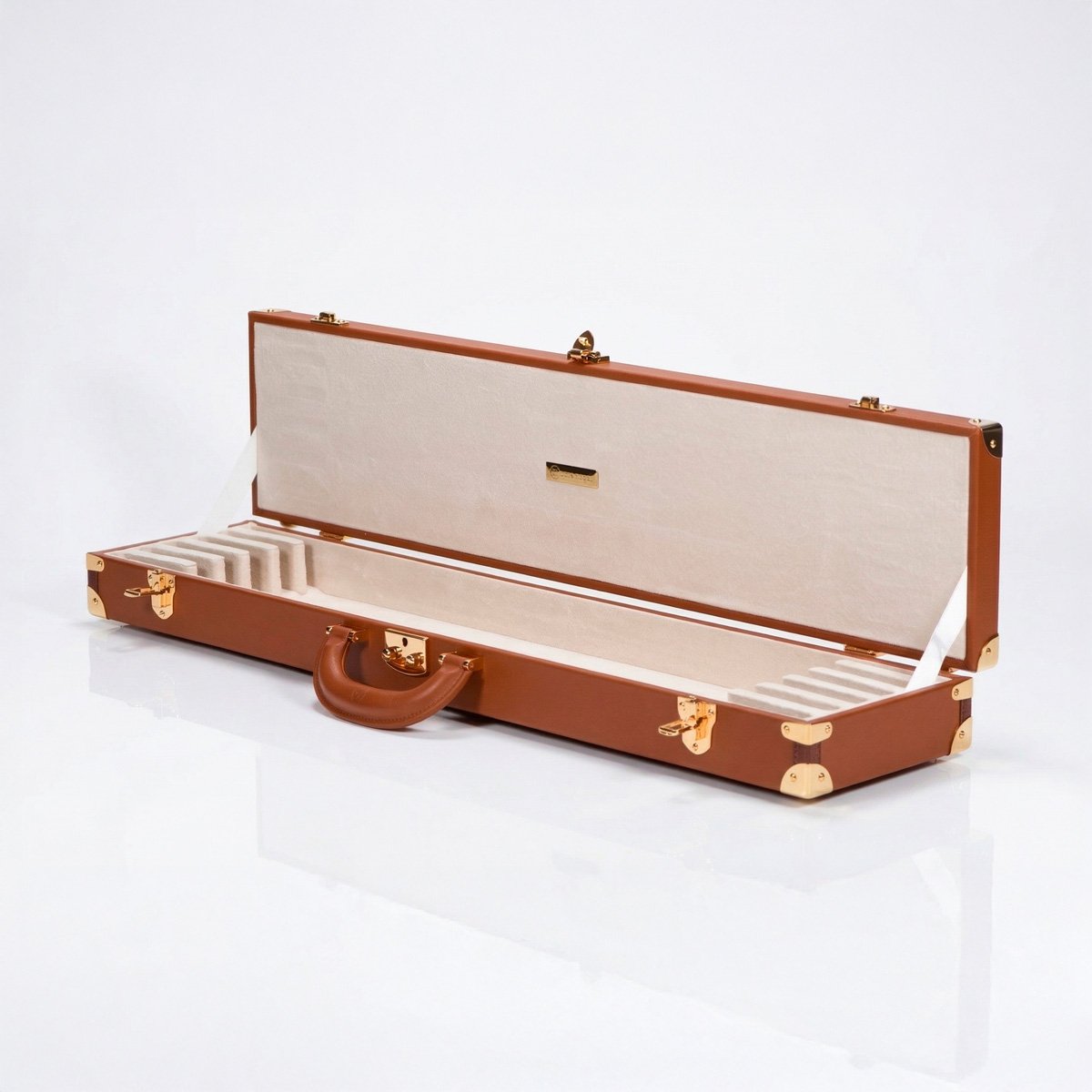 The case for 6 violin, viola or cello bows is made of a wooden structure protected by an elegant and resistant calf leather to choose between beige, brown or black colour. The interior is made with the highest quality beige suede velvet micro fiber. It includes high security dual-mechanism locks and an oversized leather handle. Locks and metallic components are available in nickel or 24k gold-plated colour.